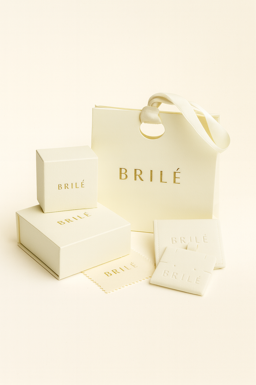 Every BRILÉ piece arrives in luxurious, thoughtfully designed packaging that reflects the essence of sophistication. Each item is carefully placed in a soft beige jewelry box, lined with delicate tissue paper and secured within our signature white shipping box. Accompanied by an elegant shopping bag and branded details, our packaging transforms unboxing into an intimate, memorable moment—because your shine deserves nothing less.